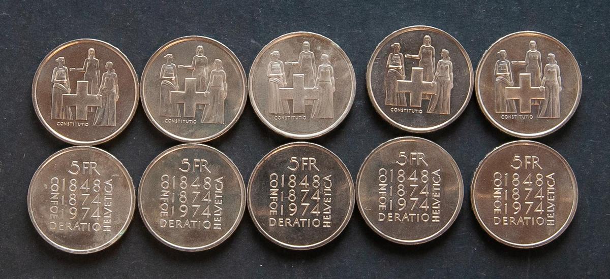 English SWITZERLAND. Set of 10 5 Franc coins commemorating the Centenary of the Revision of the Constitution. 1974. Bern. (km#52). Uncirculated.