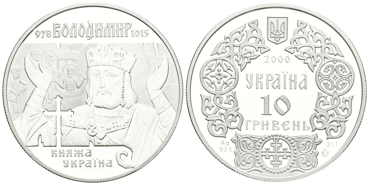 English UKRAINE. 10 Hryven (Ar.33.81g/39mm). 2000. Vladimir the Great 978-1015. (Km#122). PROOF. very rare Mintage of 5000 copies. Excellent specimen.
