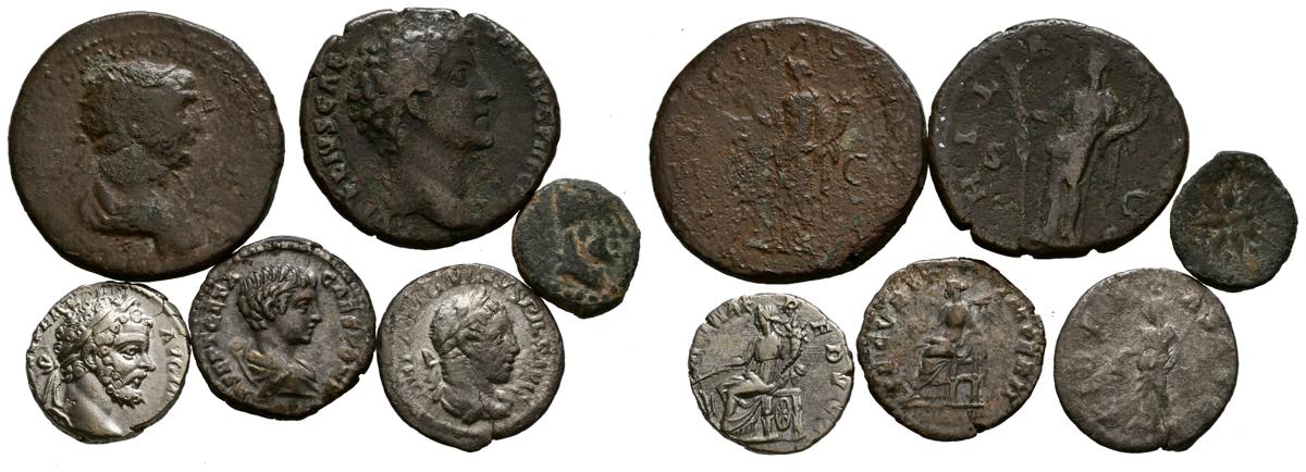 English ROMAN EMPIRE. Set of 6 coins, 5 of them Roman, which includes 3 denarii (Septimio Severo, Geta and Caracalla) and 2 bronzes from different emperors. The set is completed with a sextant from Malacca. Different states of conservation. TO EXAMINE.