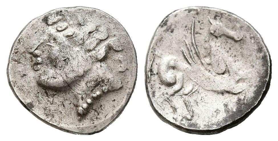 EMPORION (Ampurias, Girona). Tritartemorion. (Ar. 0.60g/10mm). 220-215 BC (ACIP 512, cataloged as R8). Obv: Female diademed head left. Rev: Pegasus flying right. Good Very Fine. Rare specimen.
