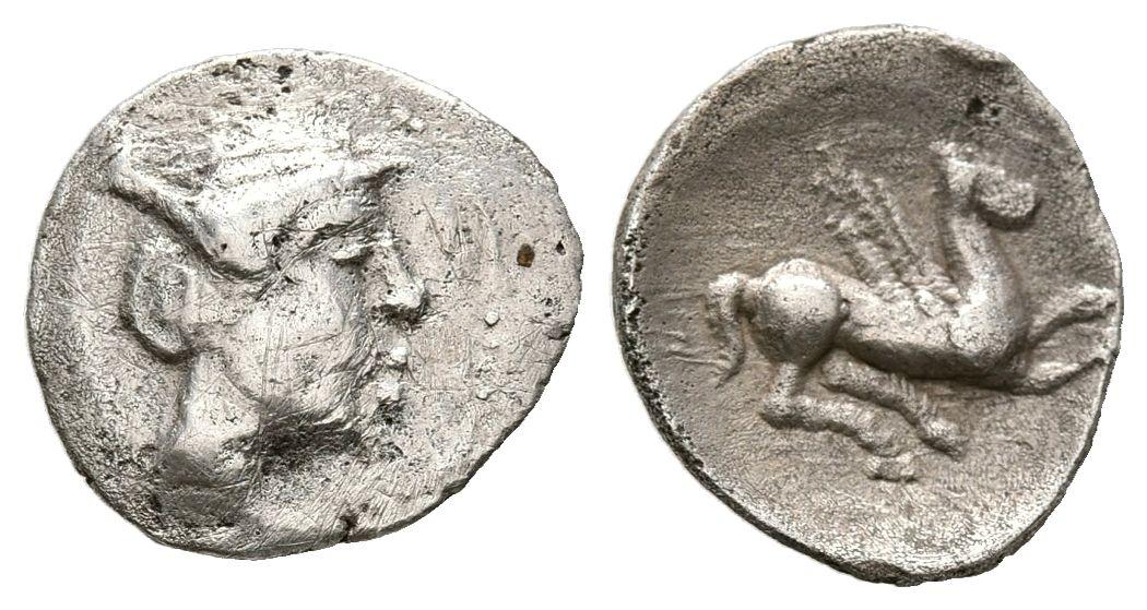 EMPORION (Ampurias, Girona). Tritartemorion. (Ar. 0.58g/11mm). 220-215 BC (FAB-1105). Obv: Female head right. Rev: Pegasus flying right. Very Fine.