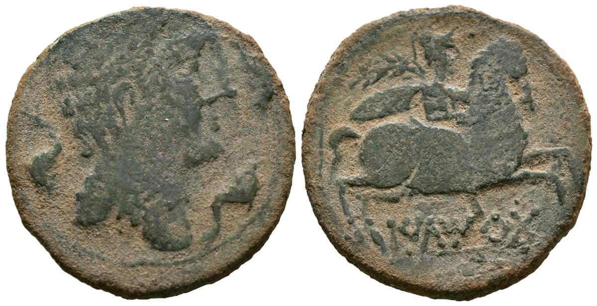 ILTIRTA (Lleida). As. (Ae. 14.81g/29mm). 200-20 BC (FAB-1461). Obv: Male head surrounded by three dolphins to right. Rev: Horseman with palm and chlamys right, below Iberian legend: ILTiRTa. Very Fine.