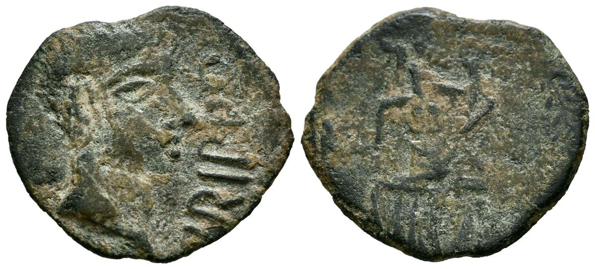 English IRIPPO (South area of Sevilla). As. (Ae. 4.52g/24mm). 30 BC (FAB-1581). Obv: Male head right, in front legend: IRIPPO. Rev: female deity seated left holding pineapple and cornucopia. Almost Very Fine/ Good Fine.
