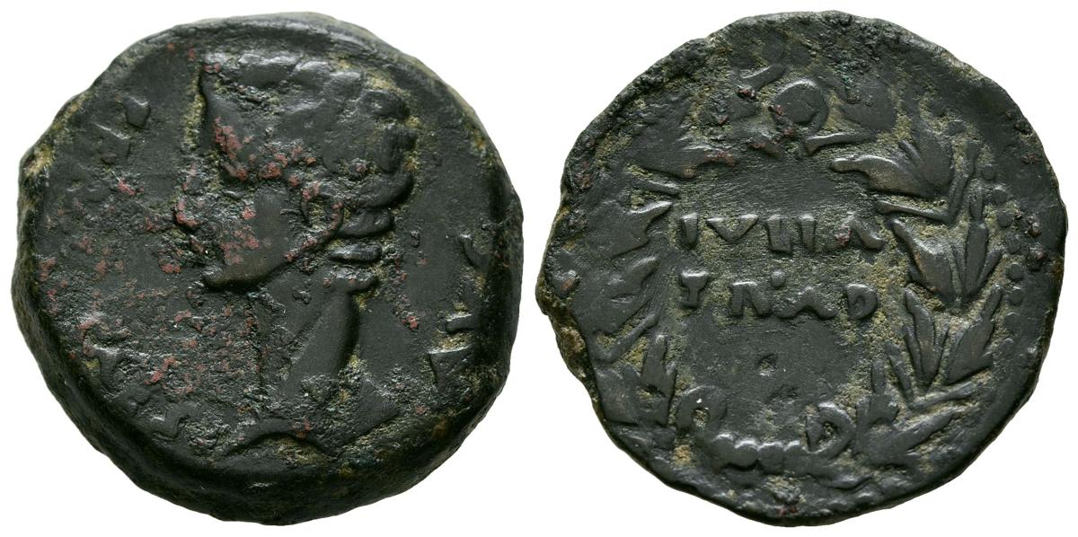 IULIA TRANSLATOR (Algeciras, Cádiz). As. (Ae. 11.37g/25mm). 27 BC-14 AD (FAB-1614). Obv: Head of Augustus left, around legend: PERM CAES AVG. Rev: Legend: IVLIA TRAD, within laurel wreath. Very Fine.