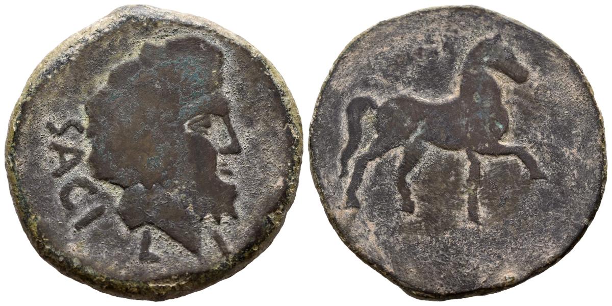 SACILI (Pedro Abad, Cordoba). As. (Ae. 17.06g/33mm). 120-50 BC (FAB-2020). Obv: Male head right, behind legend: SACILI. Rev: Horse walking to the right. Almost Very Fine. Profiled and contemporary patina.