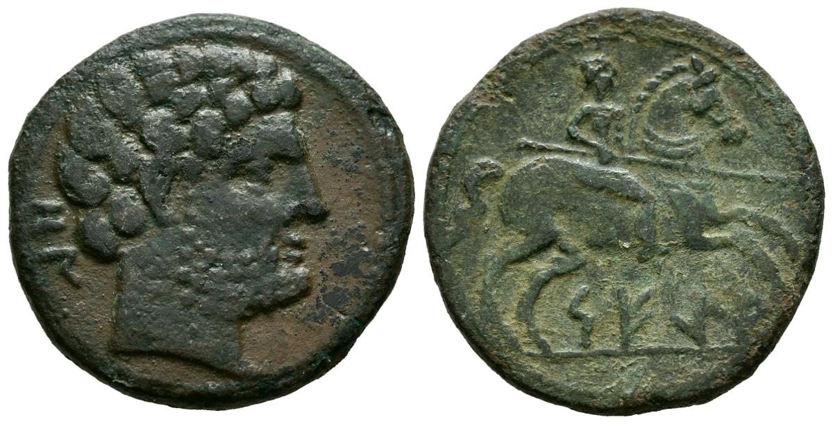 SEGIA (Ejea de los Caballeros, Zaragoza). As. (Ae. 9.06g/26mm). 120-20 BC (FAB-2160). Obv: Bearded head to right, behind Iberian letters: ON. Rev: Horseman with spear right, below Iberian legend: SEGiA. Very Fine.