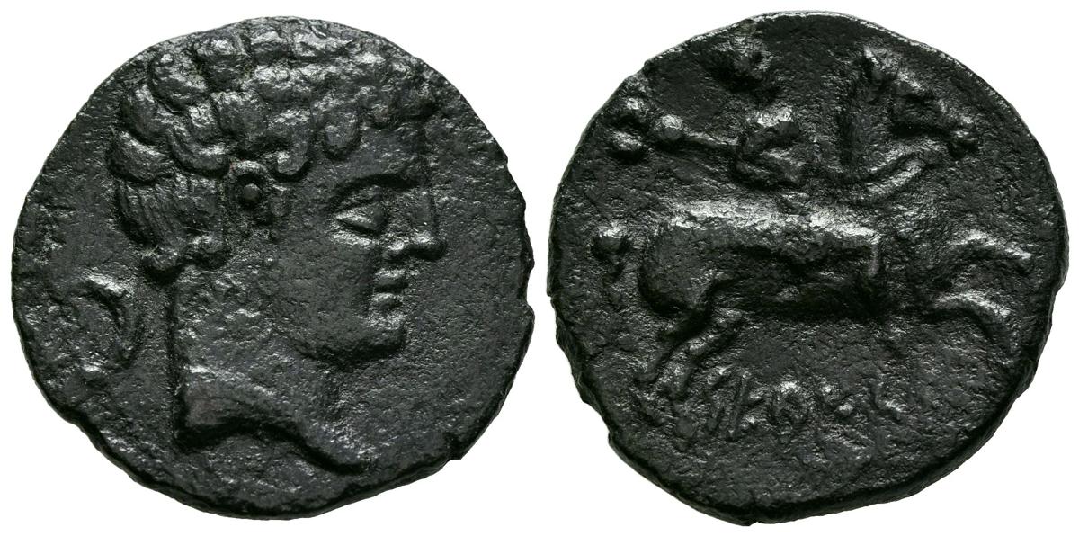 SETEISCEN (Sastago, Zaragoza). As. (Ae. 7.46g/25mm). 120-20 BC (FAB-2205). Obv: Male head to right, crescent behind. Rev: Horseman with standard to right, below Iberian legend: SETeISCeN. Very Fine.