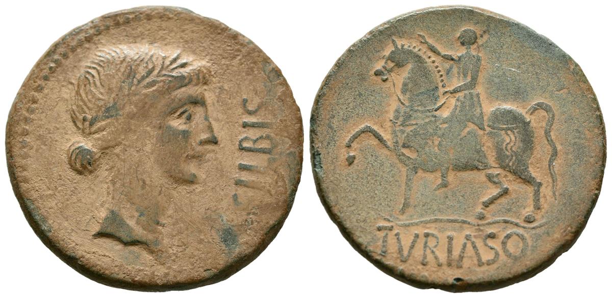 TURIASO (Tarazona, Zaragoza). As. (Ae. 11.03g/29mm). 50-20 BC (FAB-2434). Obv: Female head right, in front legend: SILBIS. Rev: Horseman with scepter right, below legend: TVRIASO. Very Fine/ Good Very Fine. Contemporary patina.