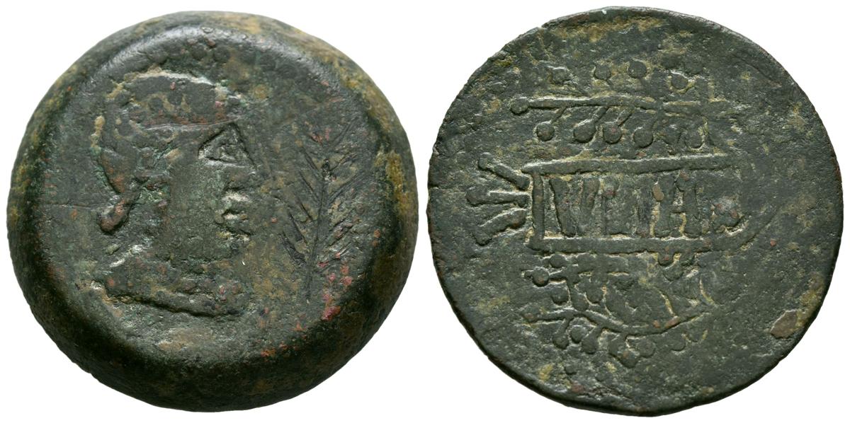 ULIA (Montemayor, Cordoba). As. (Ae. 24.29g/32mm). 50 BC (FAB-2494). Obv: Female head to right, Iberian letter Ta behind, palm in front. Rev: Legend: VLIA, within vine branches. Almost Very Fine.