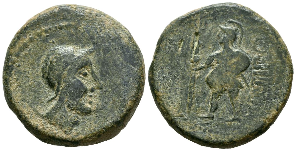 VENTIPO (Casariche, Sevilla). As. (Ae. 26.24g/30mm). 150-50 BC (FAB-2517). Obv: Helmeted male head right. Rev: Soldier with shield and lance to the left, behind legend: VENTIPO. Very Fine.