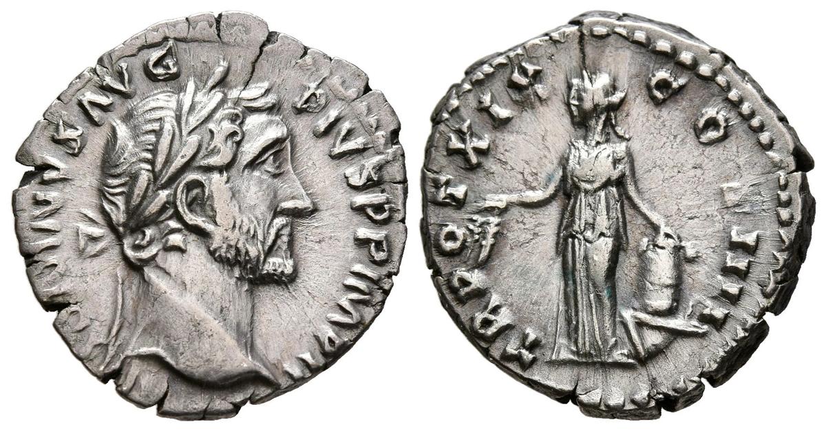 ANTONINO PIO. Denarius. (Ar. 3.17g/19mm). 155-156 AD Rome. (RIC 249). Obv: Laureate head of Antoninus Pius right, around legend: ANTONINVS AVG PIVS PP IMP II. Rev: Annona standing left bearing spikes and modium on bow, around legend: TR POT XIX COS IIII. Good Very Fine.
