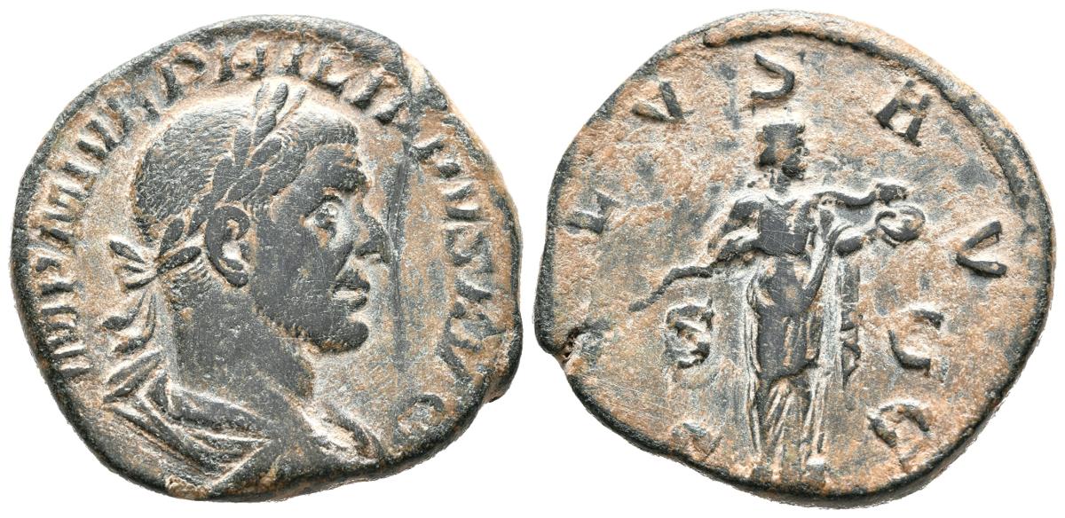 PHILIP I. Sestertius. (Ae. 16.27g/30mm). 244 AD Rome. (RIC 186a). Obv: Laureate, draped and cuirassed bust of Philip I right, legend around: IMP M IVL PHILIPPVS AVG. Rev: Salus right standing feeding a snake from a patera, between: Uncirculated, around legend: SALVS AVG. Very Fine.