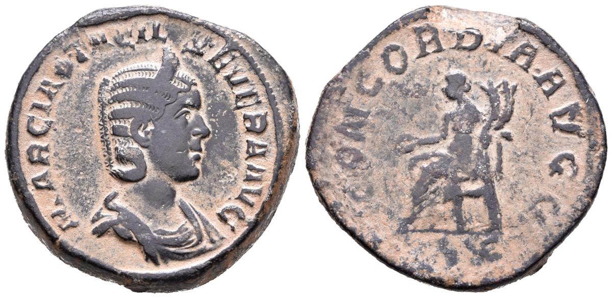 SEVERE OTACILIA. Sesterce. (Ae. 23.00g/31mm). 245-247 AD Rome. (RIC 203a). Obv: Diademed, draped and armored bust of Otacilia Severa right, around legend: MARCIA OTACILIA SEVERA AVG. Rev: Concordia seated left carrying patera and double marriage, below: Uncirculated, around legend: CONCORDIA AVGG. Almost Very Fine. Scarce copy. Added land.