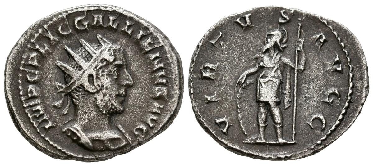 GALLIENUS. Antoninian. (Ar. 4.36g/23mm). 253-254 AD Rome. (RIC 18). Obv: Radiated and armored bust of Gallienus right, legend around: IMP CP LIC GALLIENVS AVG. Rev: Virtus standing left carrying spear and leaning on shield, around legend: VIRTVS AVGG. Very Fine.