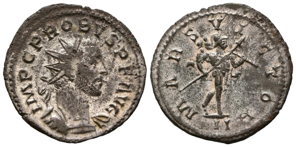 PROBUS. Antoninian. (Ae. 2.99g/23mm). 277 AD Lugdunum. (RIC 38). Obv: Radiate and armored bust of Probus right, legend around: IMP C PROBVS PF AVG. Rev: Mars advancing to the right carrying spear and trophy, in exergue: II, around legend: MARS VLTOR. Almost Extremely Fine. Remains of original silver.