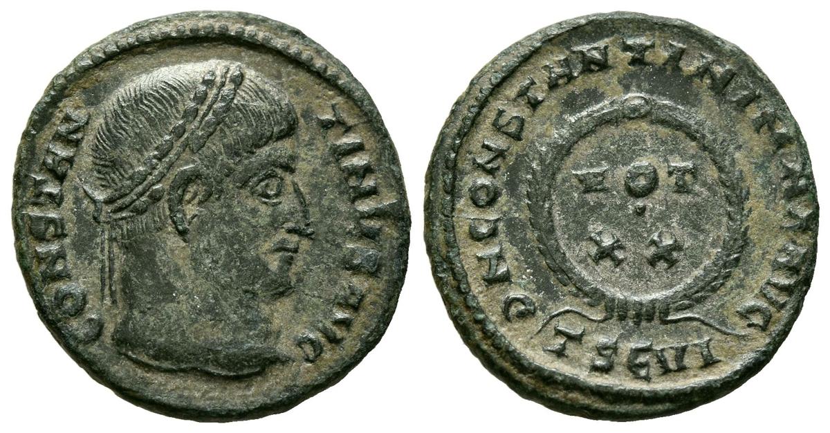 CONSTANTINE I Follis. (Ae. 2.73g/19mm). 324 AD Thessalonica. (RIC 101). Obv: Laureate head of Constantine I right, around legend: CONSTANTINVS AVG. Rev: Legend: VOT/XX within laurel, below TSEVI, around legend: DN CONSTANTINI MAX AVG. Good Very Fine.