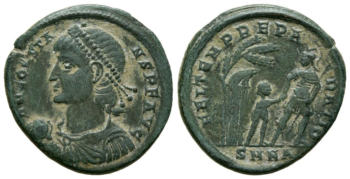 CONSTANS. Follis. (Ae. 3.65g/21mm). 348-351 AD Nicomedia. (RIC 70). Obv: Diademed breastplate of Constante left holding globe, around legend: DN CONSTANS PF AVG. Rev: Soldier advancing to the right leading a child by the hand, behind a tree, in exergue: SMNA, around legend: FEL TEMP REPARATIO. Very Fine. Green patina.