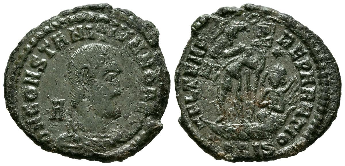 CONSTANCIO GALO. Follis. (Ae. 5.34g/25mm). 351-354 AD Siscia. (RIC 329). Obv: Draped and breastplate bust of Constans right, behind: A, around legend: DN CONSTANS PF AVG. Rev: standing left holding Victoria with laurel wreath and standard, behind Victoria seated left, below: ASIS, around legend: FEL TEMP REPARATIO. Very Fine. Green patina. Scarce copy.