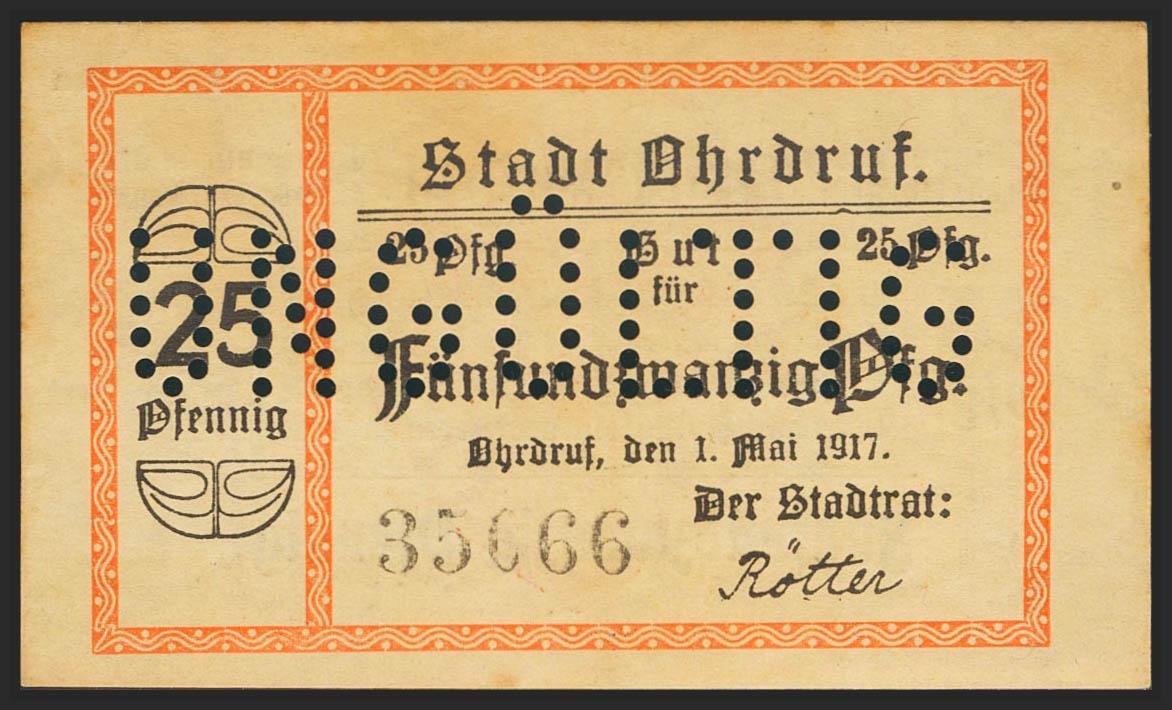 GERMANY. NOTGELD (OHDRUF). 25 Pfennig. 1917. Numbered, not stamped. UNGÜLTIG in perforation. Rare. Uncirculated.