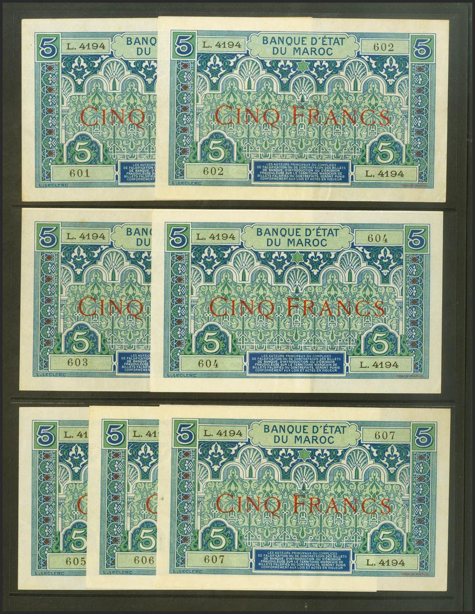 MOROCCO. Group of 7 correlative banknotes of 5 Francs. (1924ca). (Pick: 9). Extremely Fine- / Very Fine+.