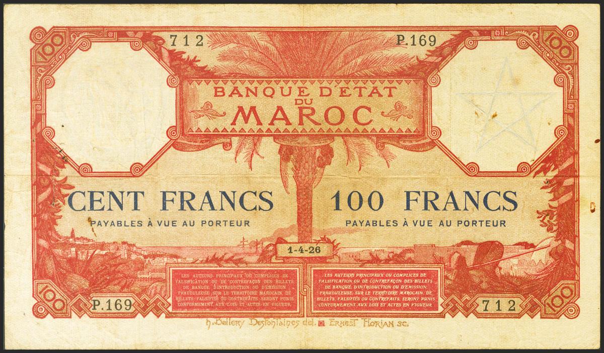 MOROCCO. 100 Francs. 1 April 1926. (Pick: 14). Staples holes. Very Good.