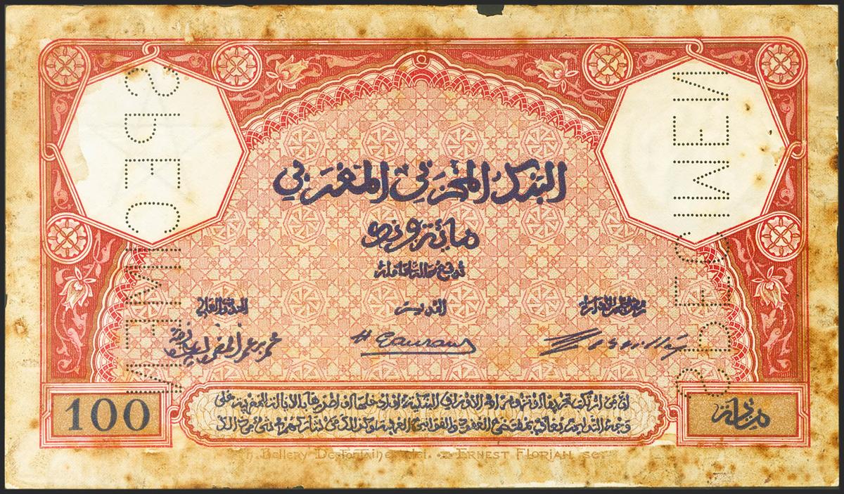 MOROCCO. 100 Francs. (1926ca). SPECIMEN and numbering 000. (Pick: 14s). Rare, defects. About Good.