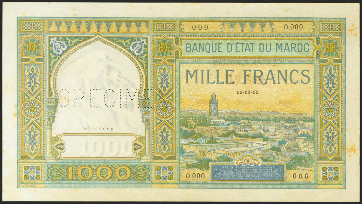 MOROCCO. 1000 Francs. (1929ca). SPECIMEN and numbering 00000000. (Pick: 16s). Spots rust margin and 2 mm cut margin. Extremely Fine.