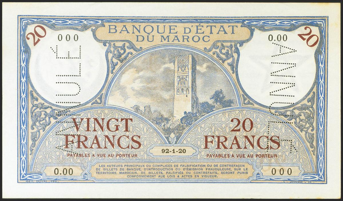MOROCCO. 20 Francs. (1929ca). Specimen, numbering 000 and perforation ANNULÉ. (Pick: 18as). Extremely Rare, especially with the text: PAYABLES A VUE AU PORTEUR, spots rust only in the margin. Uncirculated--.