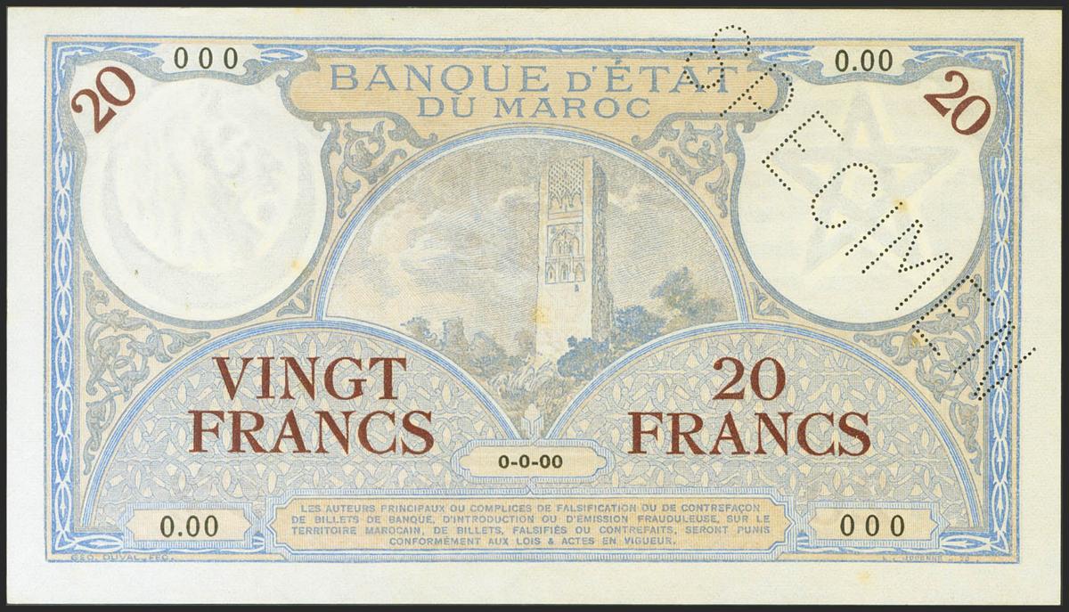 MOROCCO. 20 Francs. (1929ca). Specimen, numbering 000. (Pick: 18bs). Very rare, spots rust. Uncirculated--.