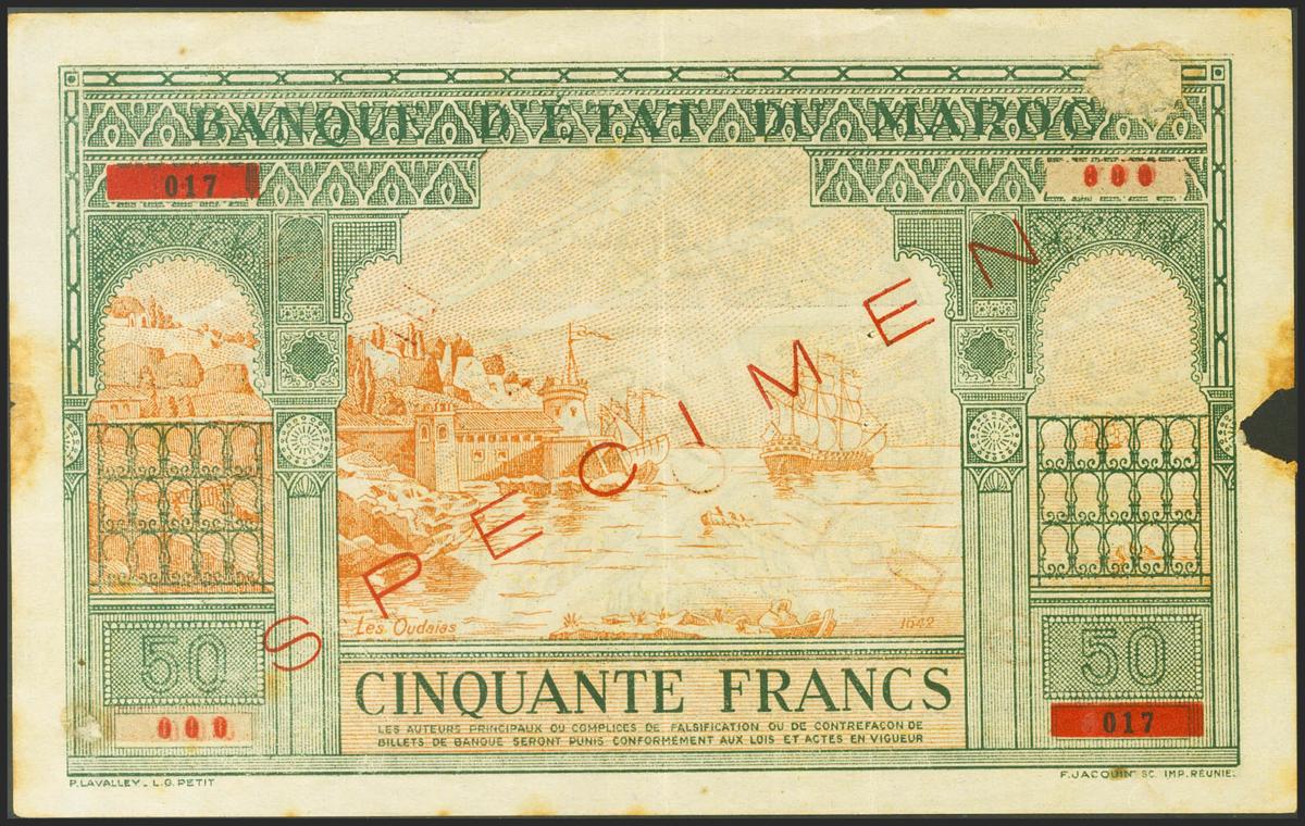 MOROCCO. 50 Francs. (1943ca). SPECIMEN and numbering 000. (Pick: 40s). Very rare, defects. Good.