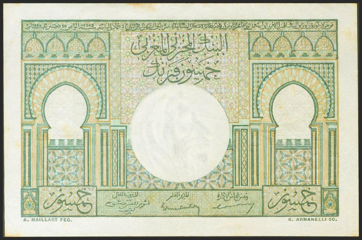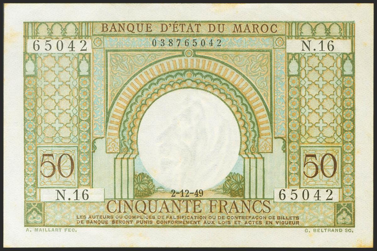 MOROCCO. 50 Francs. 1949. (Pick: 44). Spots rust. Extremely Fine.