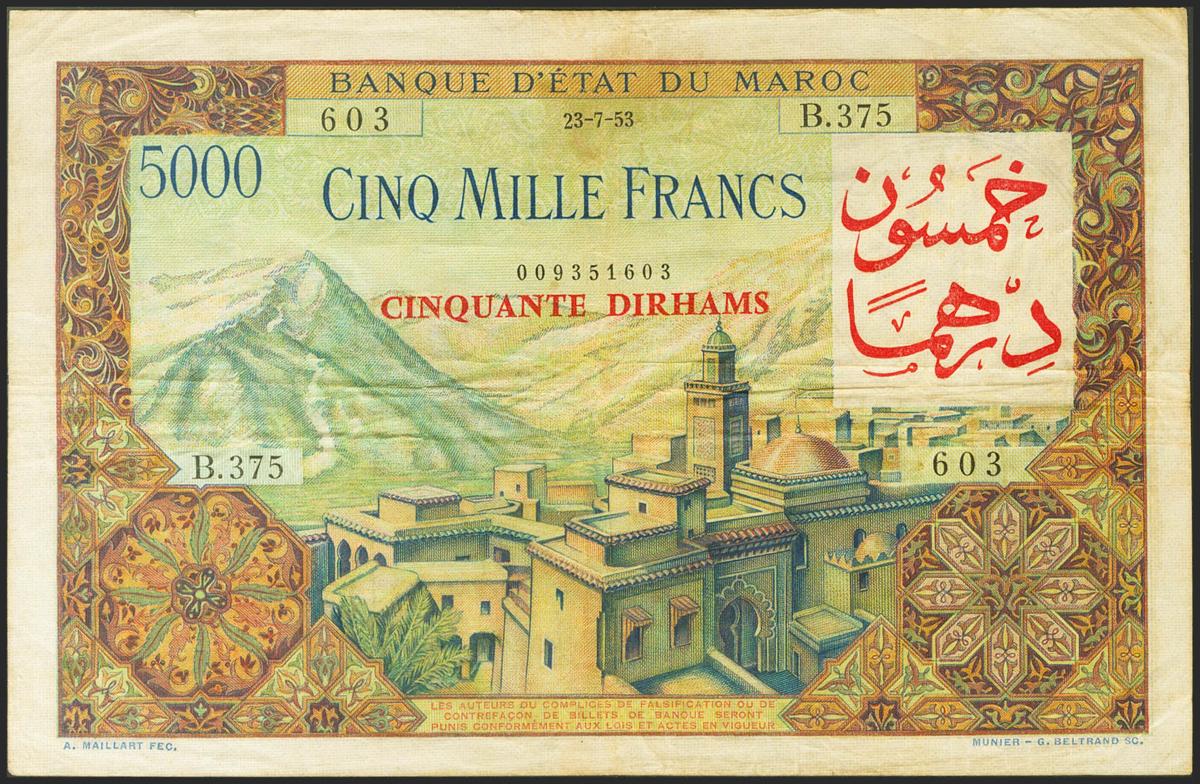 MOROCCO. 5000 Francs. 23 July 1953. (Pick: 51). Rare. Fine-.