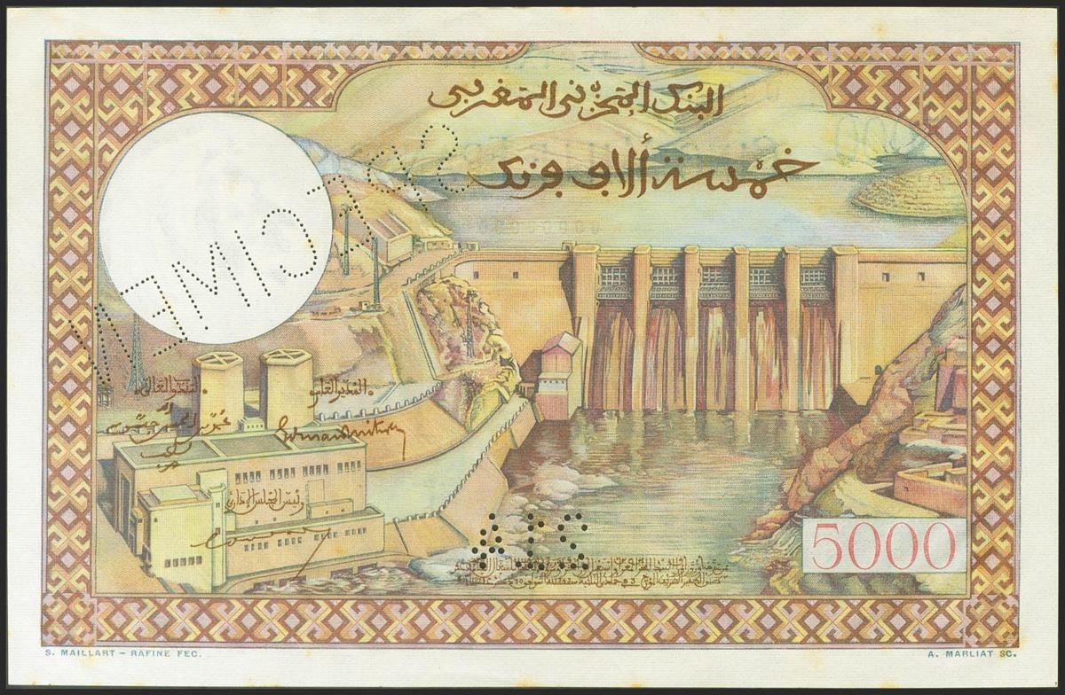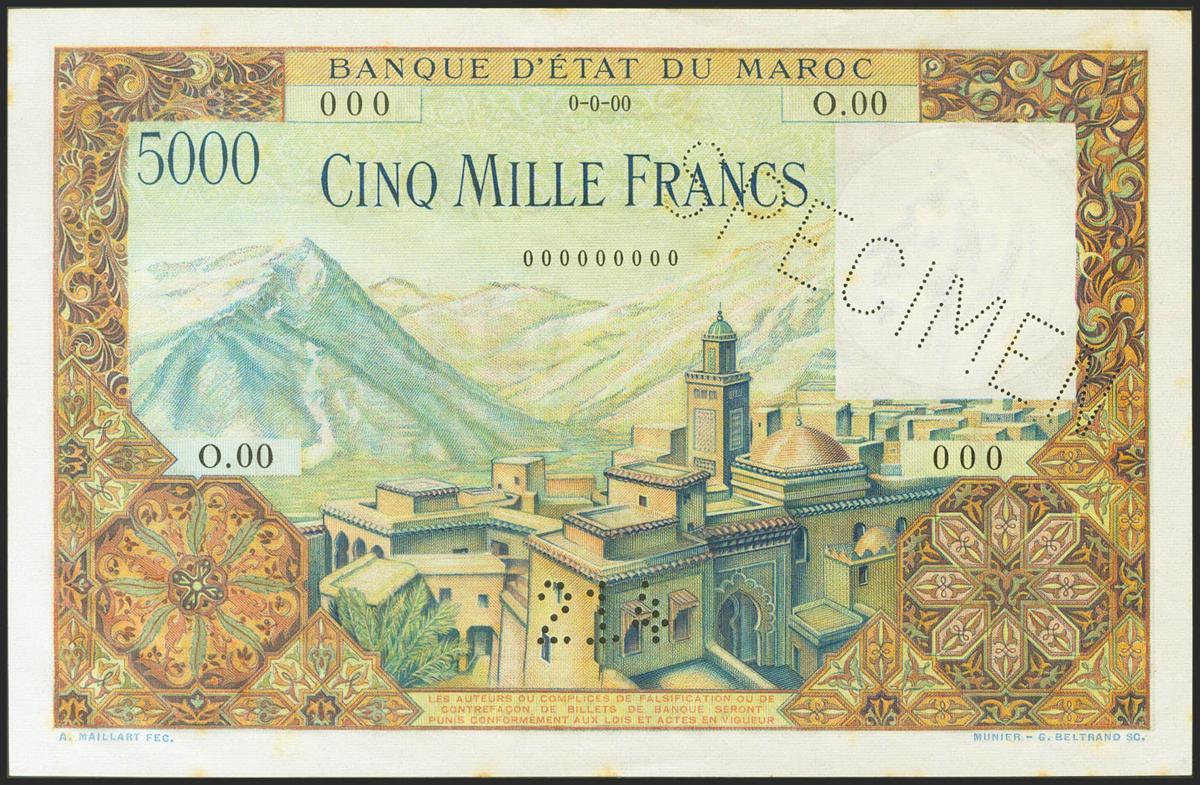 MOROCCO. 5000 Francs. (1953ca). SPECIMEN, perforated 214 and numbering 000000000. (Pick: 51s). Spots rust. Uncirculated-.