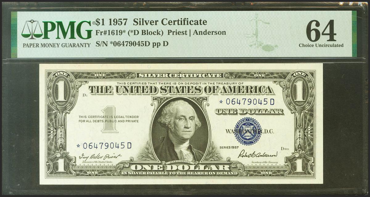 USA. 1 Dollar. Silver Certificate Note. Serial number *-D. 1957. (Friedberg: 1619*, Pick: 419a). Uncirculated. PMG64.