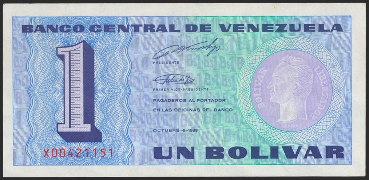 VENEZUELA. 1 Bolívar. 5 de Octubre de 1989. Firmado por Pedro R. Tirico Hijo y José Vicente Rodríguez Aznar. Serie X. (Pick: 68, Sleiman: 5). SC.