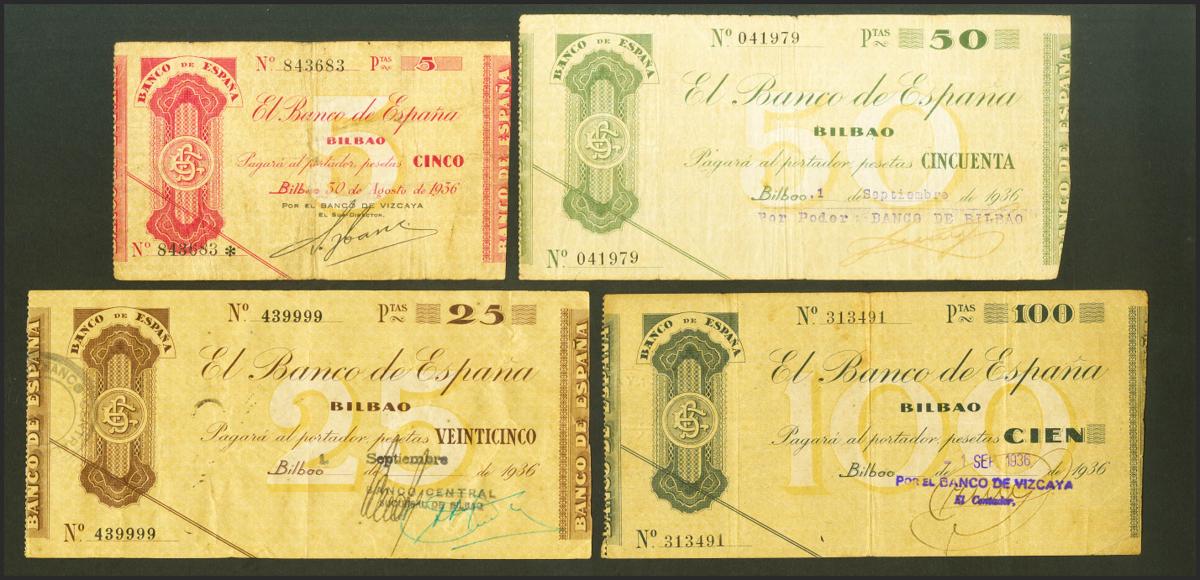 English Complete series of 4 banknotes of 5 Pesetas, 25 Pesetas, 50 Pesetas and 100 Pesetas, not including the 5 Pesetas with series A, issued from August 30, 1936 by the Bank of Spain in Bilbao (Edifil 2017: 368/ 71). Good Very Fine/ Good Fine.