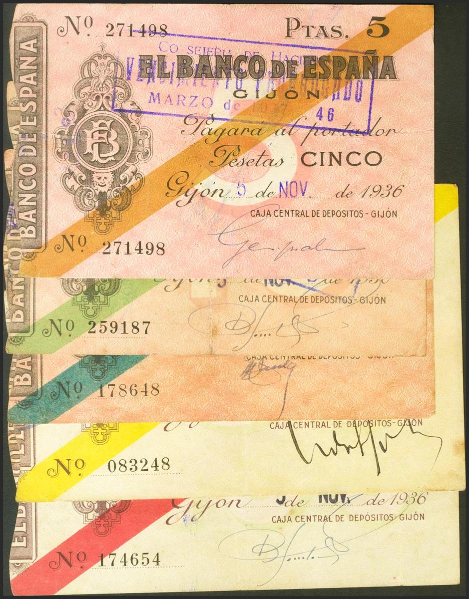 English Set of 5 banknotes of 5 Pesetas, 10 Pesetas, 25 Pesetas, 50 Pesetas and 100 Pesetas issued by the Gijón branch on November 5, 1936. (Edifil 2021: 380/84). Set of enormous quality, we remember that these banknotes are very rarely found in high quality. Almost Extremely Fine/ Good Very Fine.