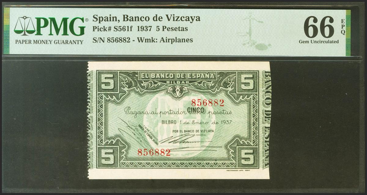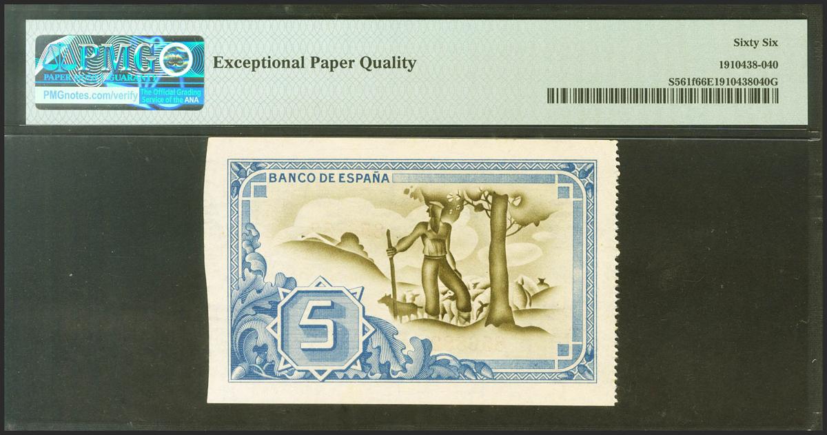 5 pesetas. January 1, 1937. Bilbao branch, countersignature of Banco de Vizcaya. Without series, with numbering and without matrices. (Edifil 2021: 385f, Pick: S561f). original sizing Uncirculated. PMG66EPQ package.