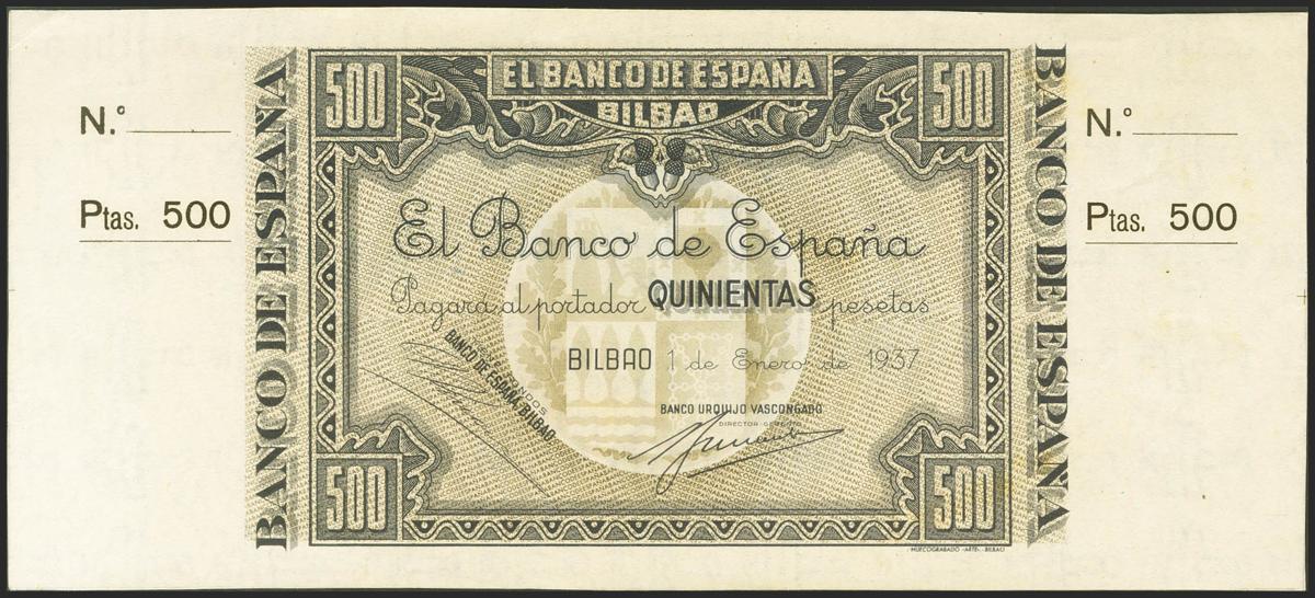 500 pesetas. January 1, 1937. Without series and with two matrices. Antefirma Banco Urquijo Vascongado. (Edifil 2021: NE26f). It presents much of its original sizing, usual shades of time. Extremely Fine.