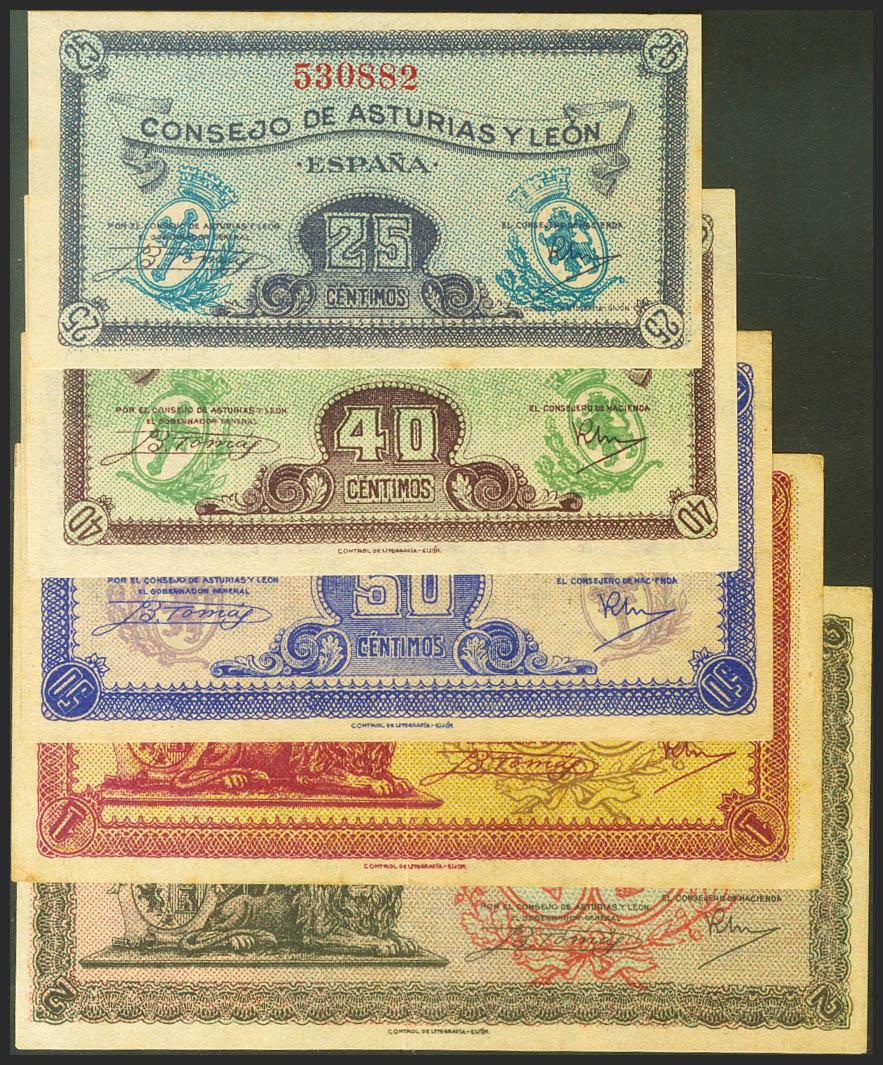 Complete series including 25 Cents, 40 Cents, 50 Cents, 1 Peseta and 2 Pesetas. 1937. Asturias and Leon. No serie. (Edifil 2021: 394/98). Almost Extremely Fine/ Good Very Fine.