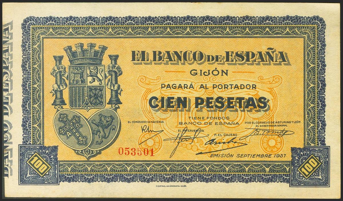 100 pesetas. September 1937. Asturias and León. No serie. (Edifil 2021: 399). original sizing Uncirculated.