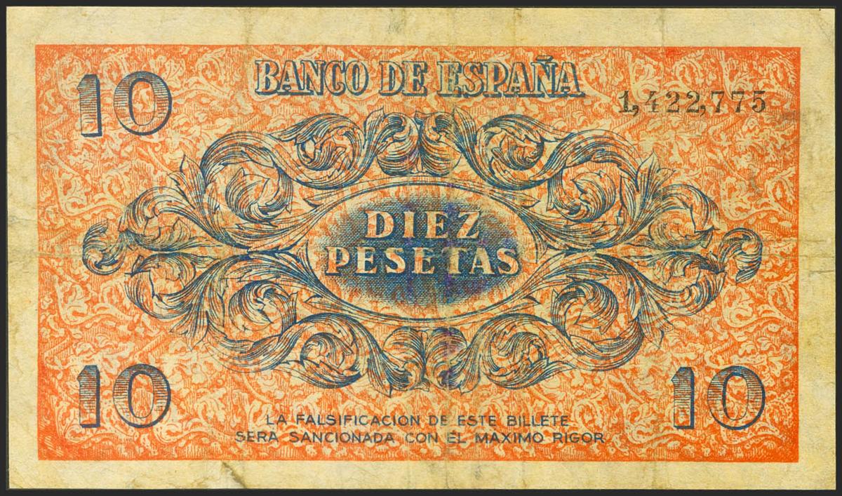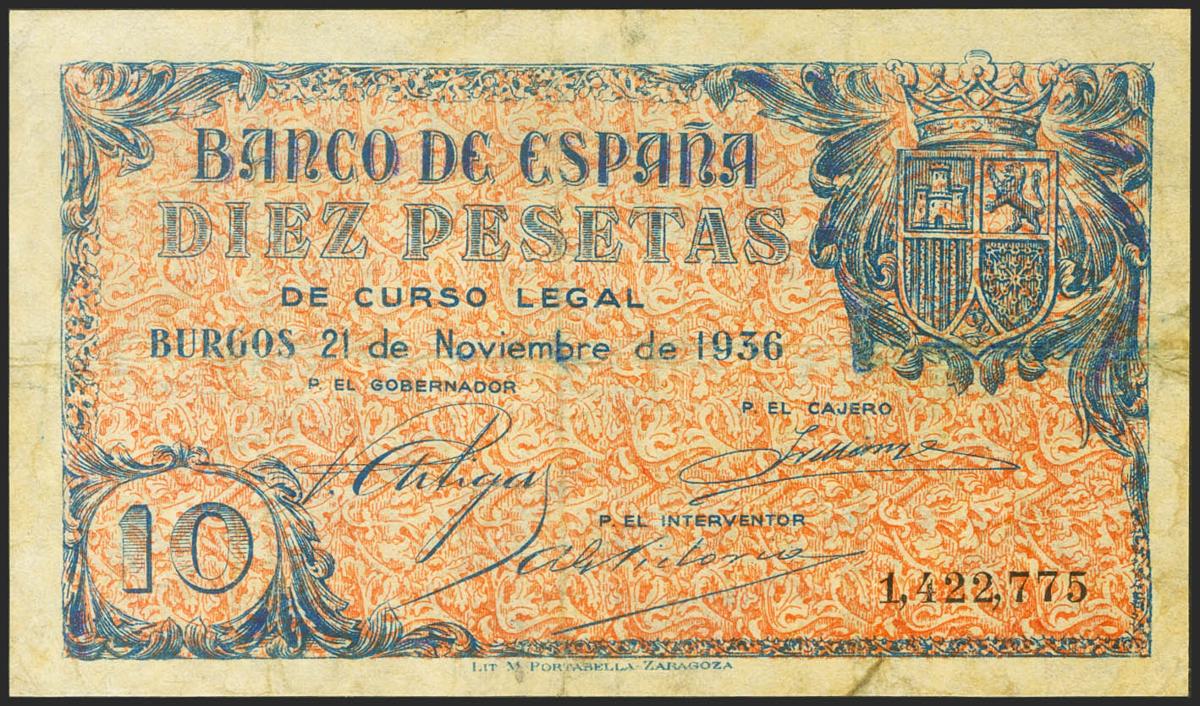 10 pesetas. November 21, 1936. No series. (Edifil 2021: 418). Rare, minimal repairs. Almost Very Fine.