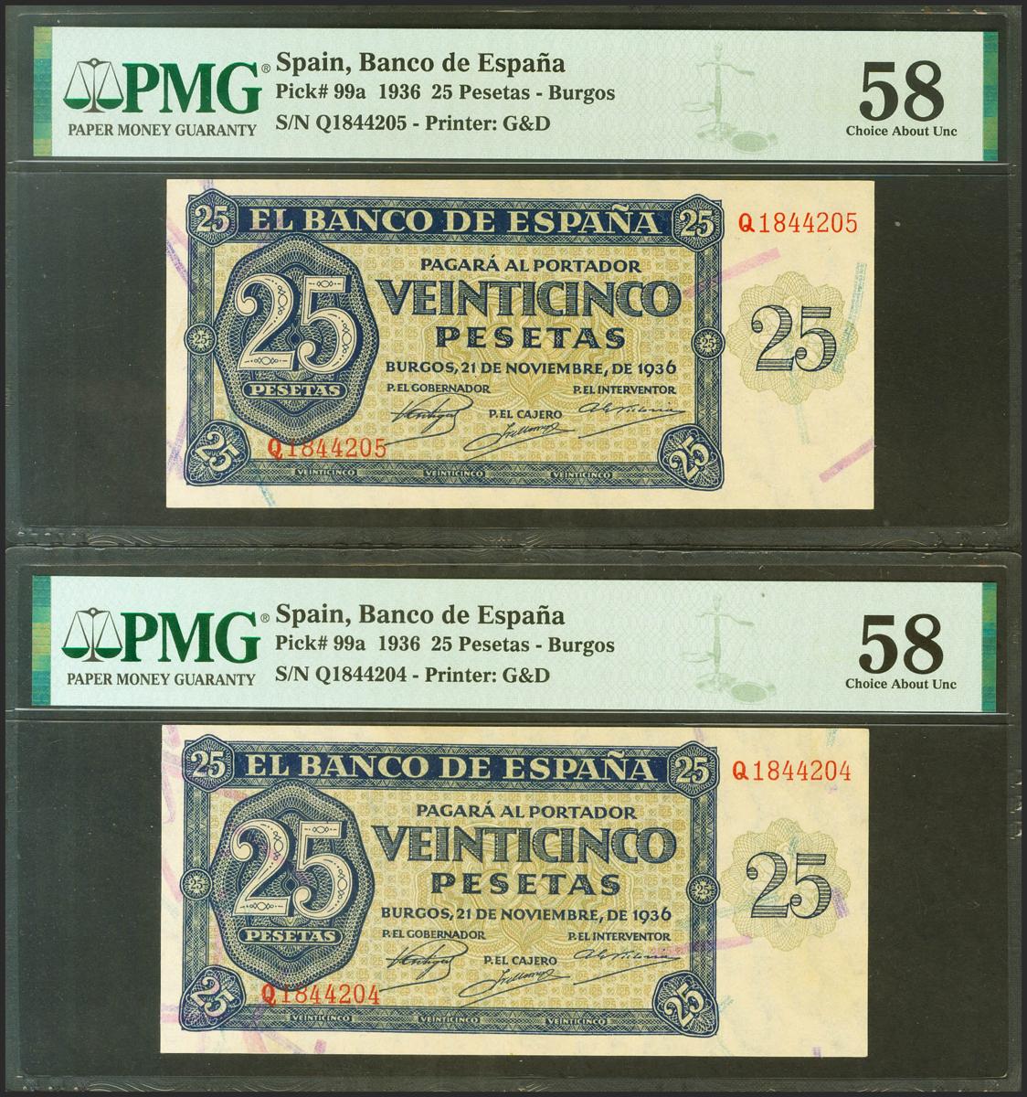 25 pesetas. November 21, 1936. Correlative couple. Series Q. (Edifil 2021: 419a, Pick: 99a). original sizing EBC++. PMG58 packages, both.