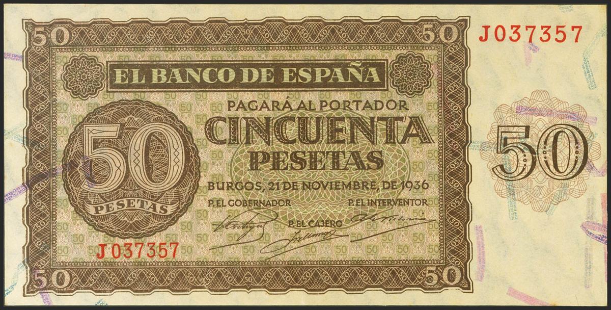 50 pesetas. November 21, 1936. Series J. (Edifil 2021: 420a). It retains much of its original size. Good Extremely Fine.
