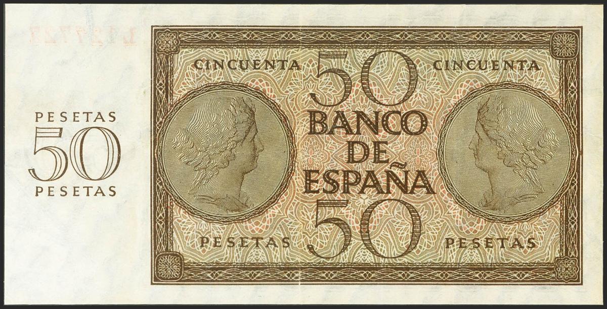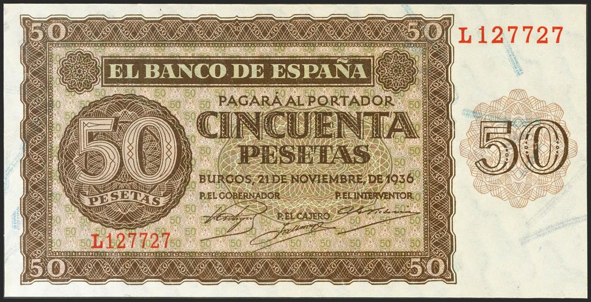 50 pesetas. November 21, 1936. Series L. (Edifil 2021: 420a). It retains part of its original size. Good Very Fine.