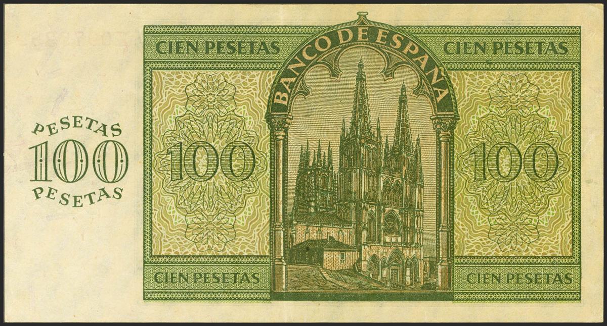 100 pesetas. November 21, 1936. Series X, last series issued. (Edifil 2021: 421a). It retains much of the original sizing. Good Extremely Fine.