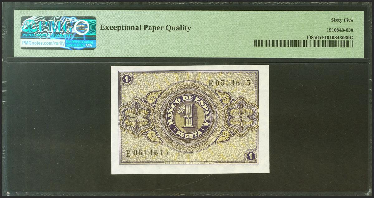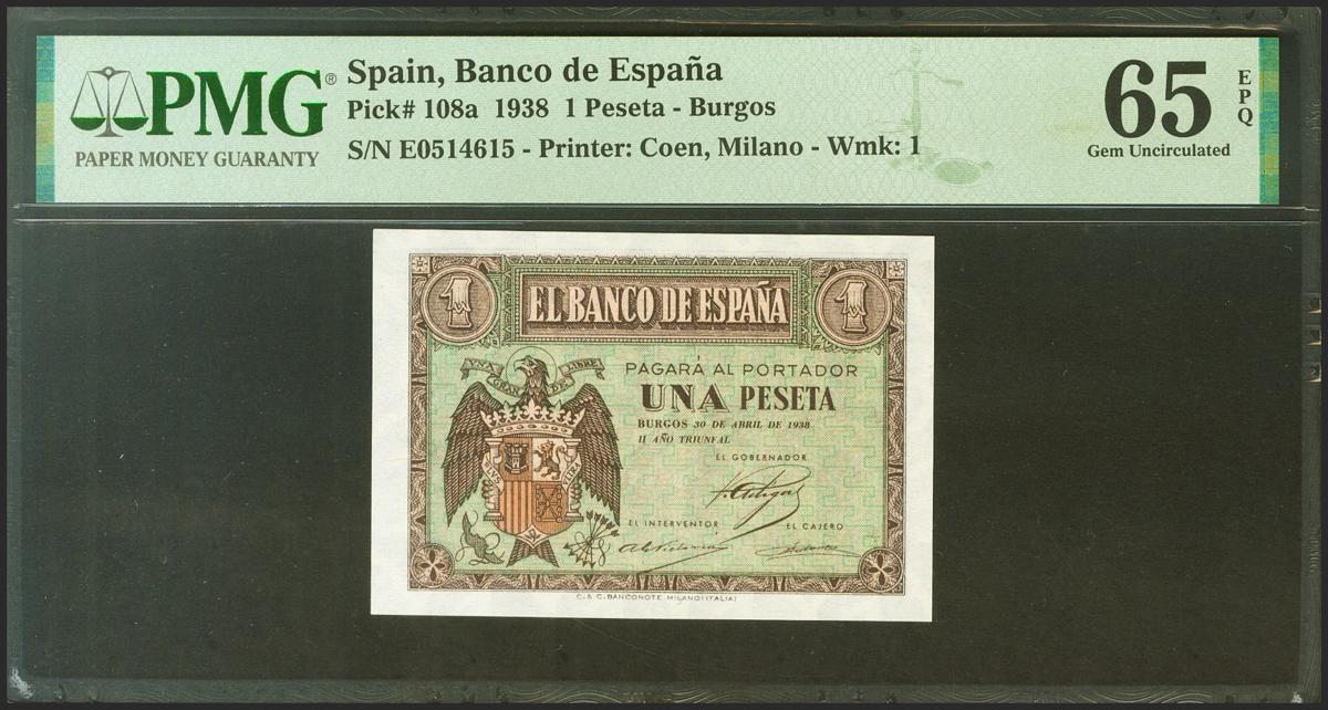 1 peseta. April 30, 1938. Series E. (Edifil 2021: 428a, Pick: 108a). original sizing Uncirculated. PMG65EPQ package.