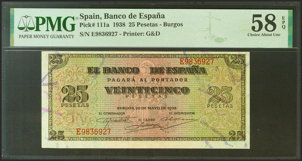 25 pesetas. May 20, 1938. Series E. (Edifil 2021: 430a, Pick: 111a). original sizing EBC+++. PMG58EPQ package.