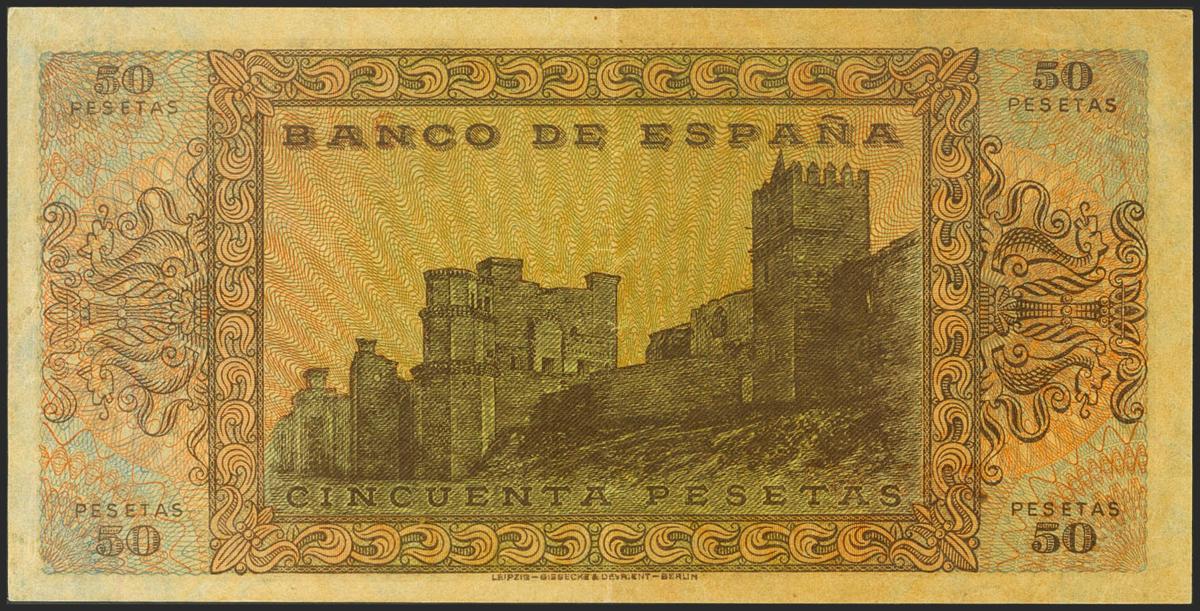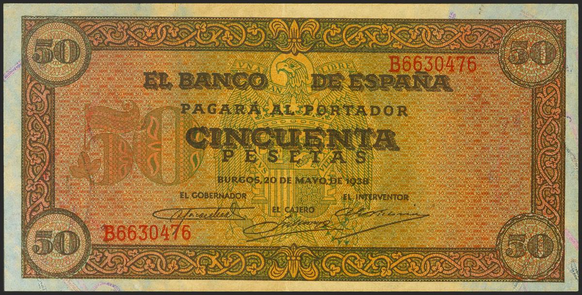 50 pesetas. May 20, 1938. Series B. (Edifil 2021: 431a). It retains part of the original sizing. Good Extremely Fine.