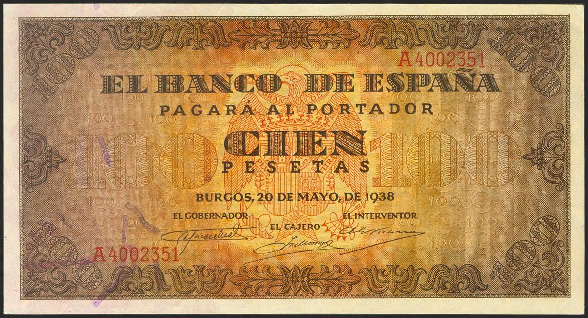 100 pesetas. May 20, 1938. Series A. (Edifil 2021: 432, Pick: 113). Rare in this quality, it retains all its original sizing. Uncirculated.